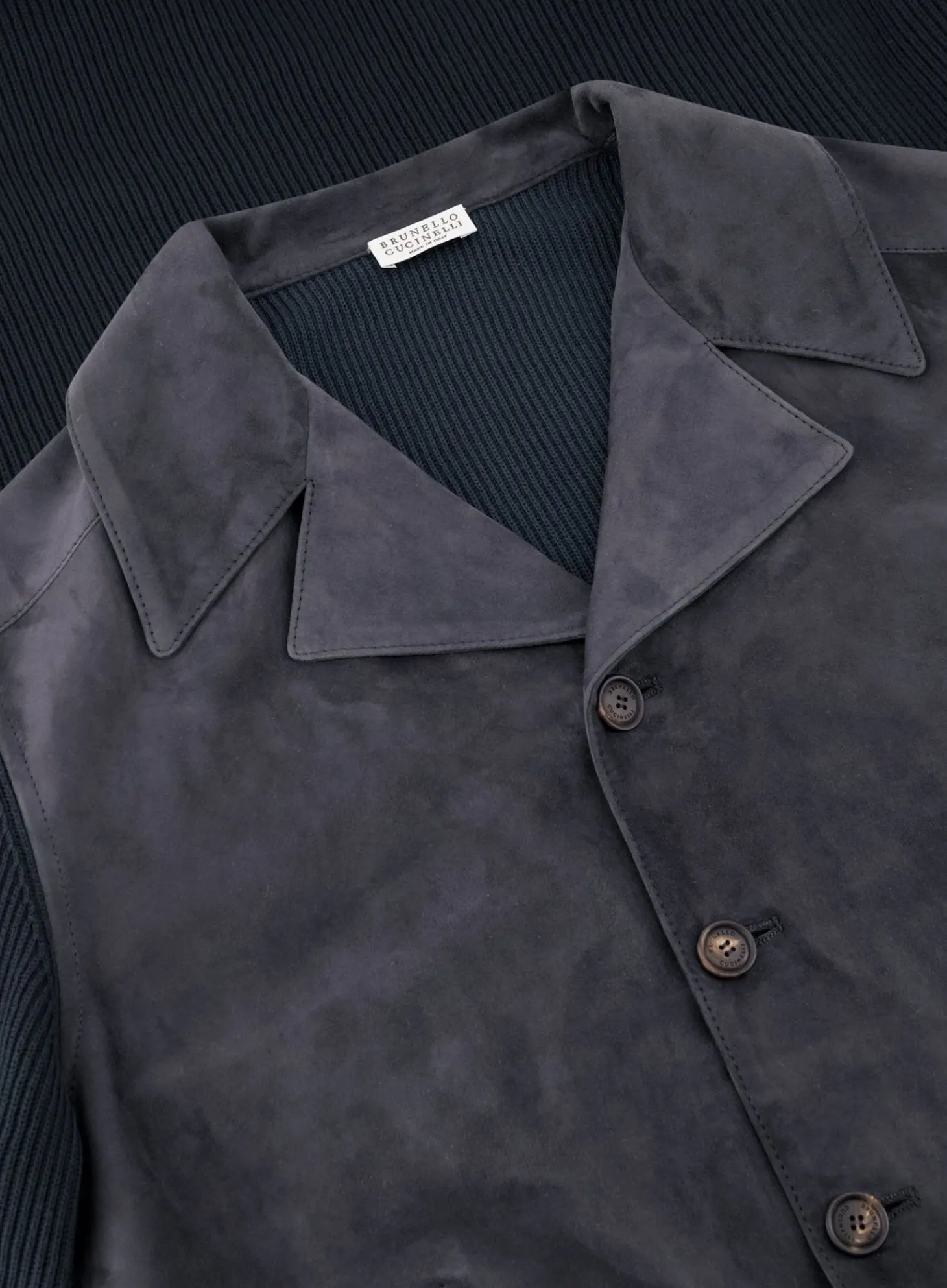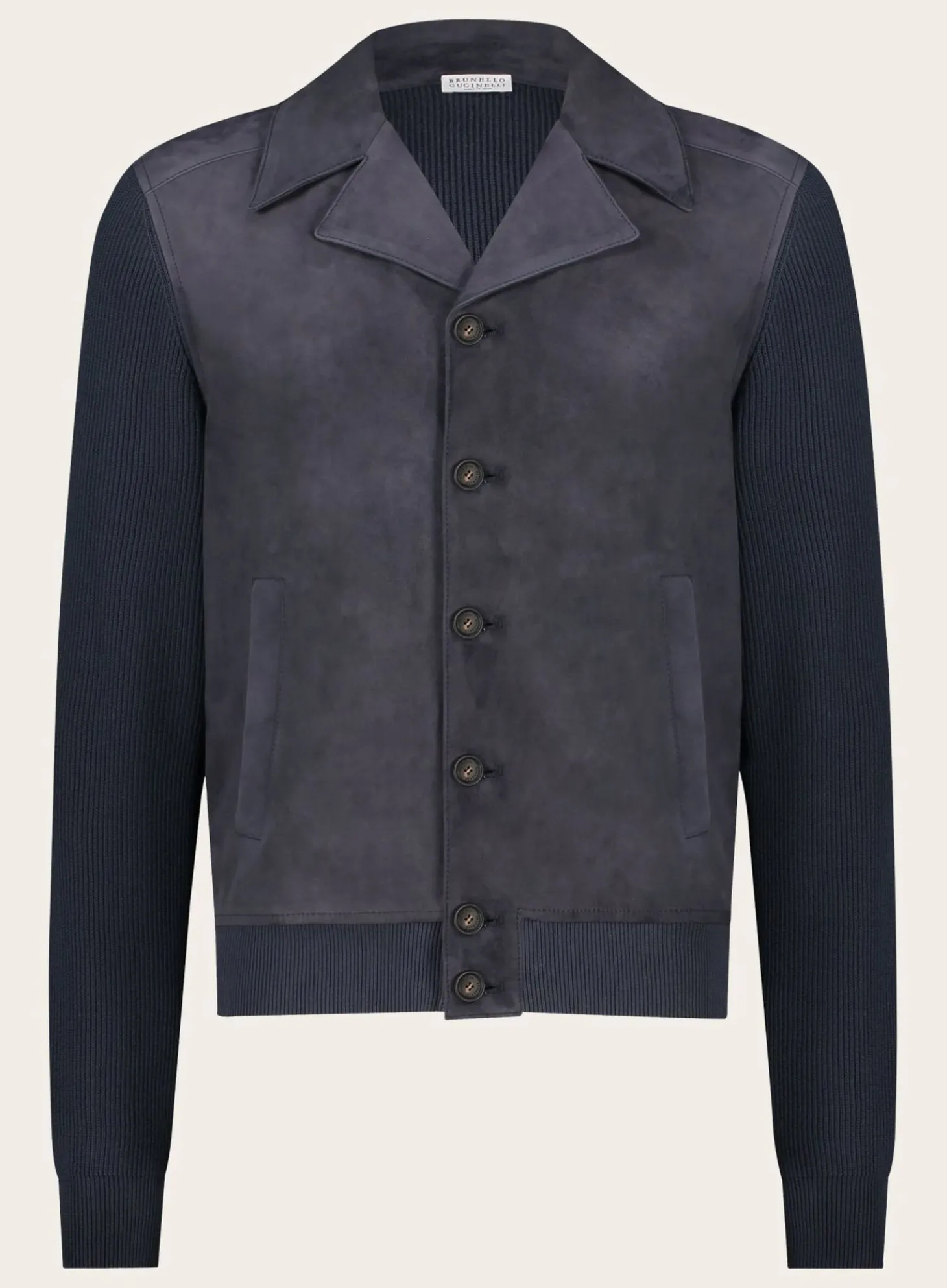 Deze Jas Wordt Verrijkt Met Iconische Textuurcombinaties, Waarbij De Materialen Van Brunello Cucinelli De Stijl Accentueren. De Voorkant Van Het Kledingstuk Is Gemaakt Van Verfijnd Suède, Terwijl De Mouwen, De Inzetstukken Op De Randen En De Achterkant Gedetailleerd Zijn Met Zacht Katoenen Breisel Voor Een Verfijnd Materiaalcontrast.