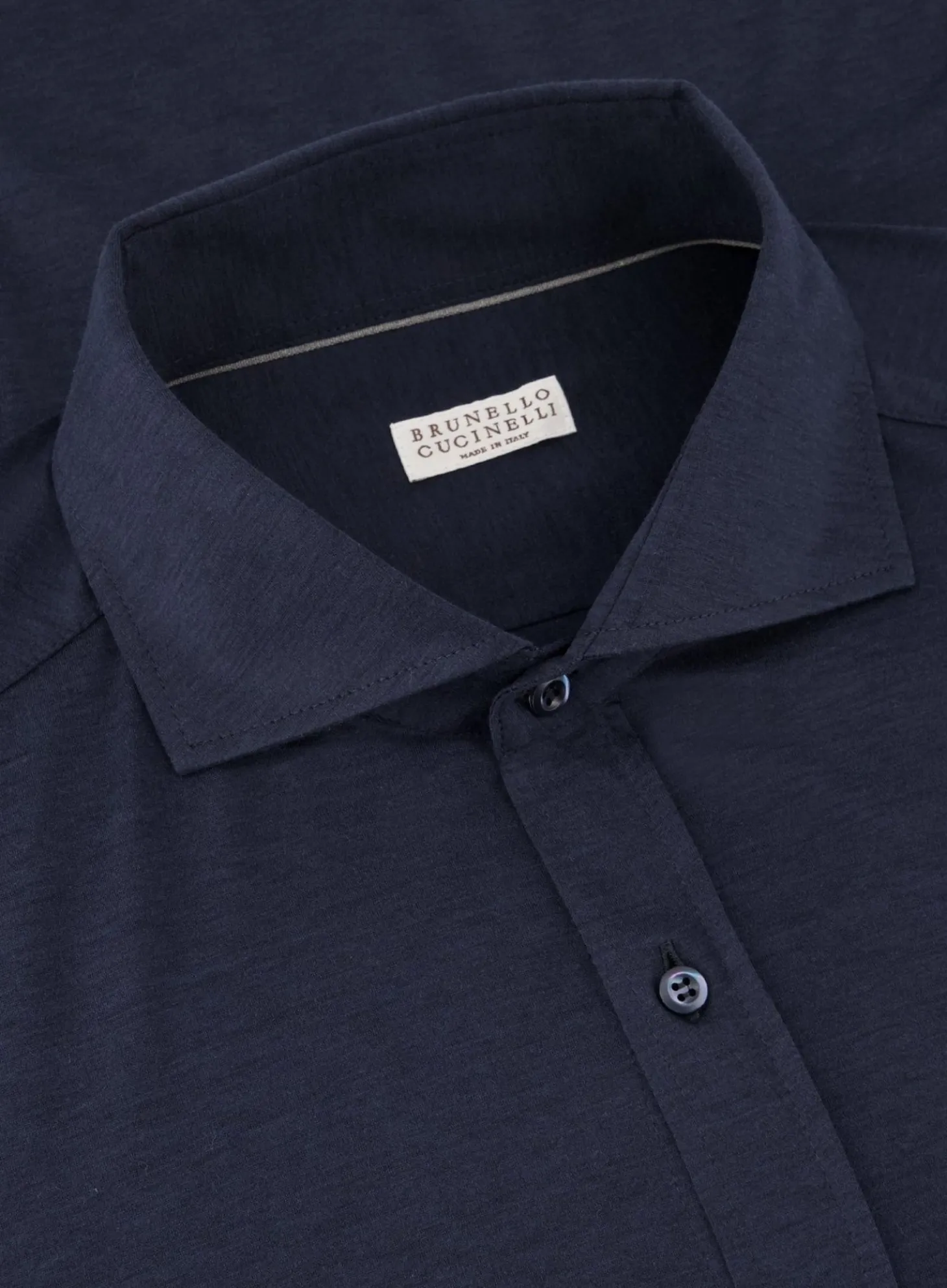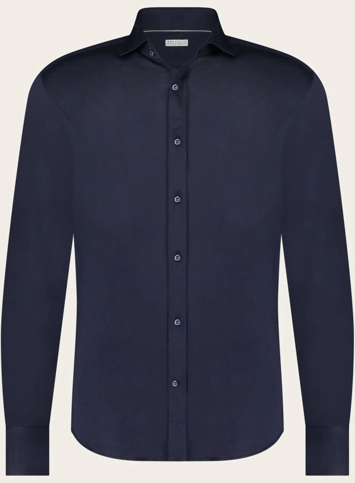 Dit Elegante Marineblauwe Herenshirt Is Een Verfijnd Item Van Brunello Cucinelli. Het Is Vervaardigd Uit Een Luxe Mengsel Van Zijde En Katoen, Wat Zorgt Voor Een Comfortabele Pasvorm En Een Subtiele Glans. Met Lange Mouwen En Klassieke Kraag Biedt Dit Shirt Veelzijdigheid En Kan Het Zowel In Een Formele Als Casual Setting Gedragen Worden.