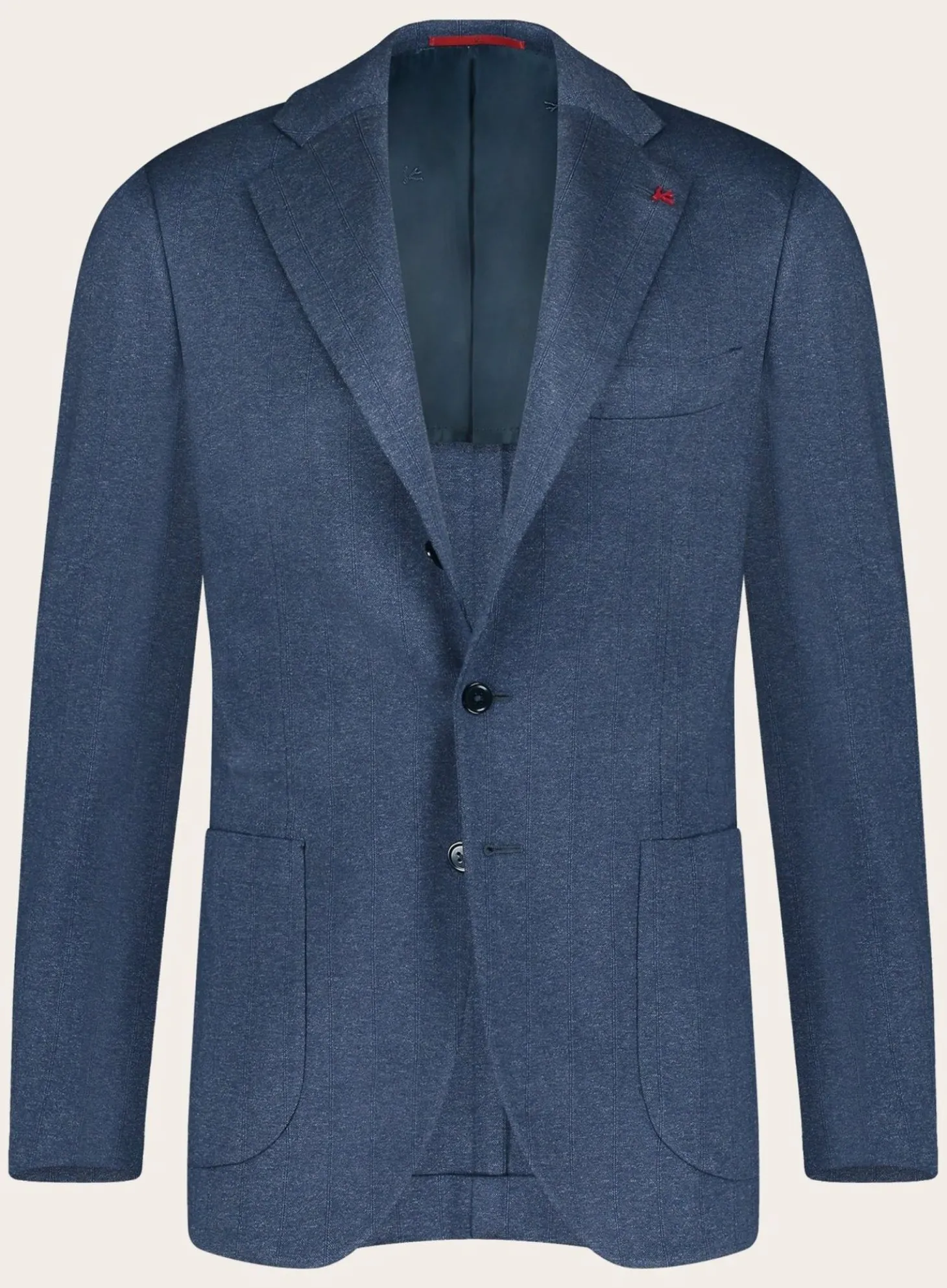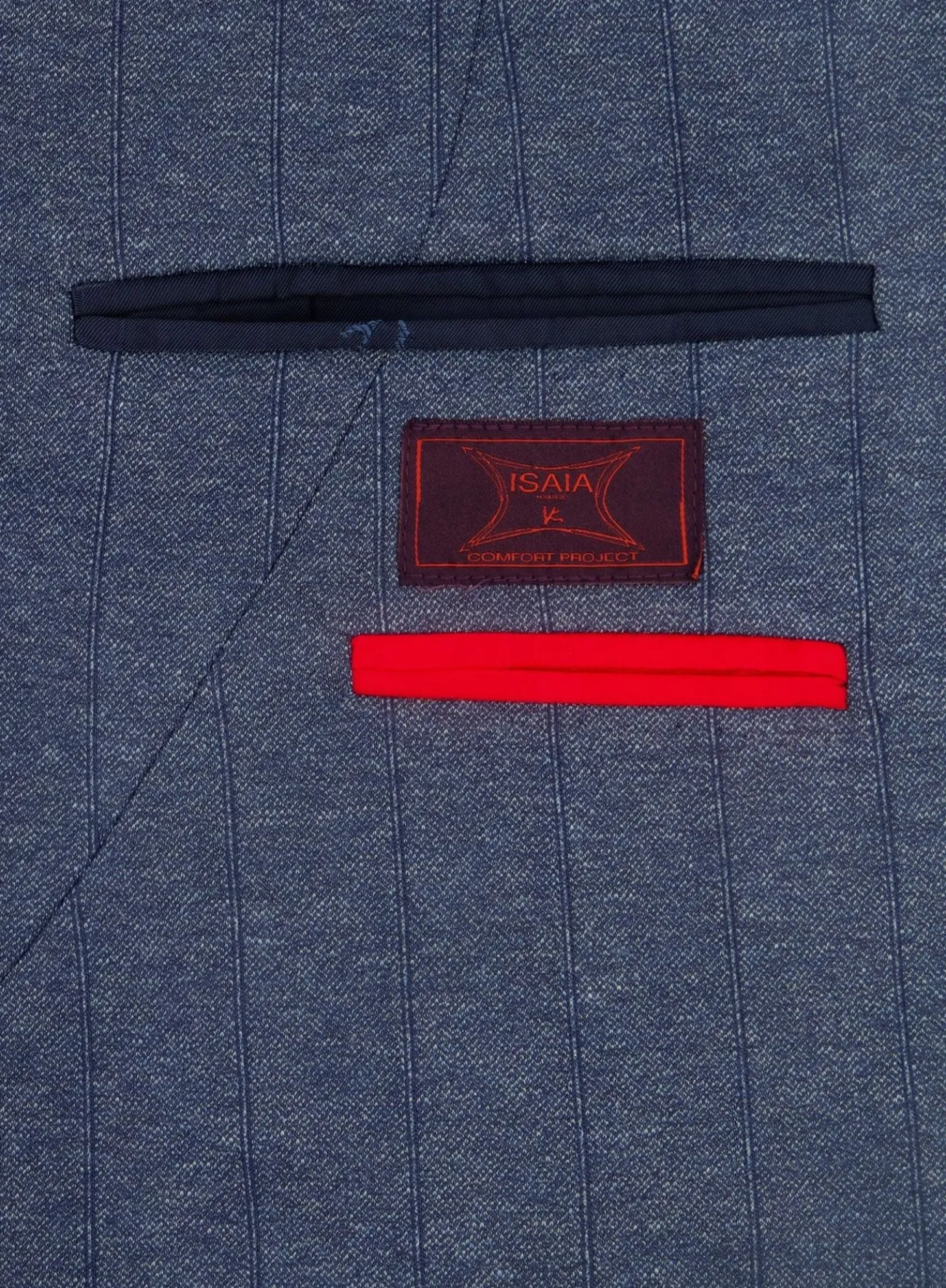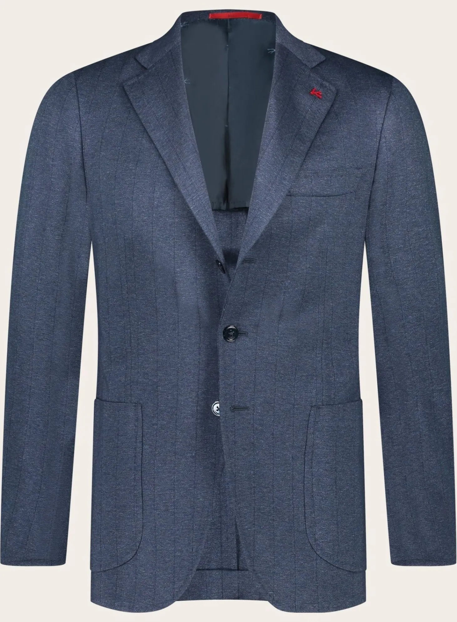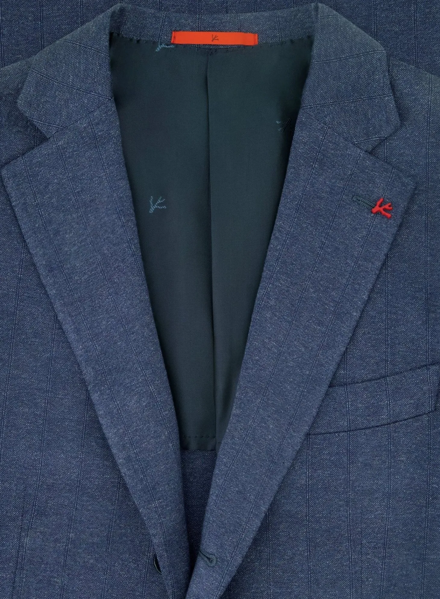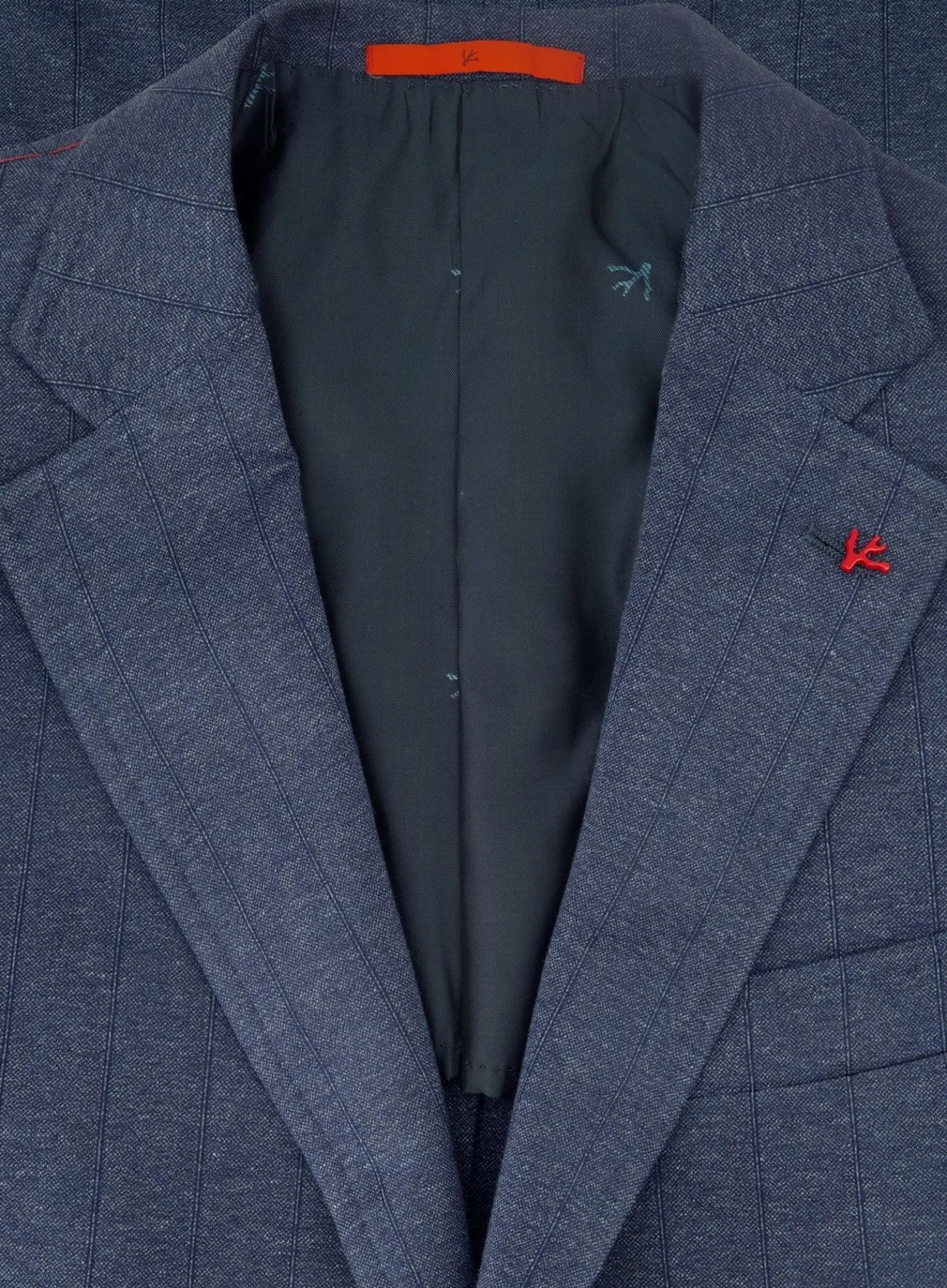 Dit Jasje Van Isaia Is Gemaakt Van Luxueus Blauwe Stofl. Het Biedt Een Zachte Textuur En Een Lichte Schouderconstructie Voor Comfort En Bewegingsvrijheid, Terwijl Het Een Strakke, Getailleerde Vorm Behoudt. Een Subtiele Isaia-Koraalpin Op De Revers Dient Als Een Stijlvol En Herkenbaar Merkdetail.