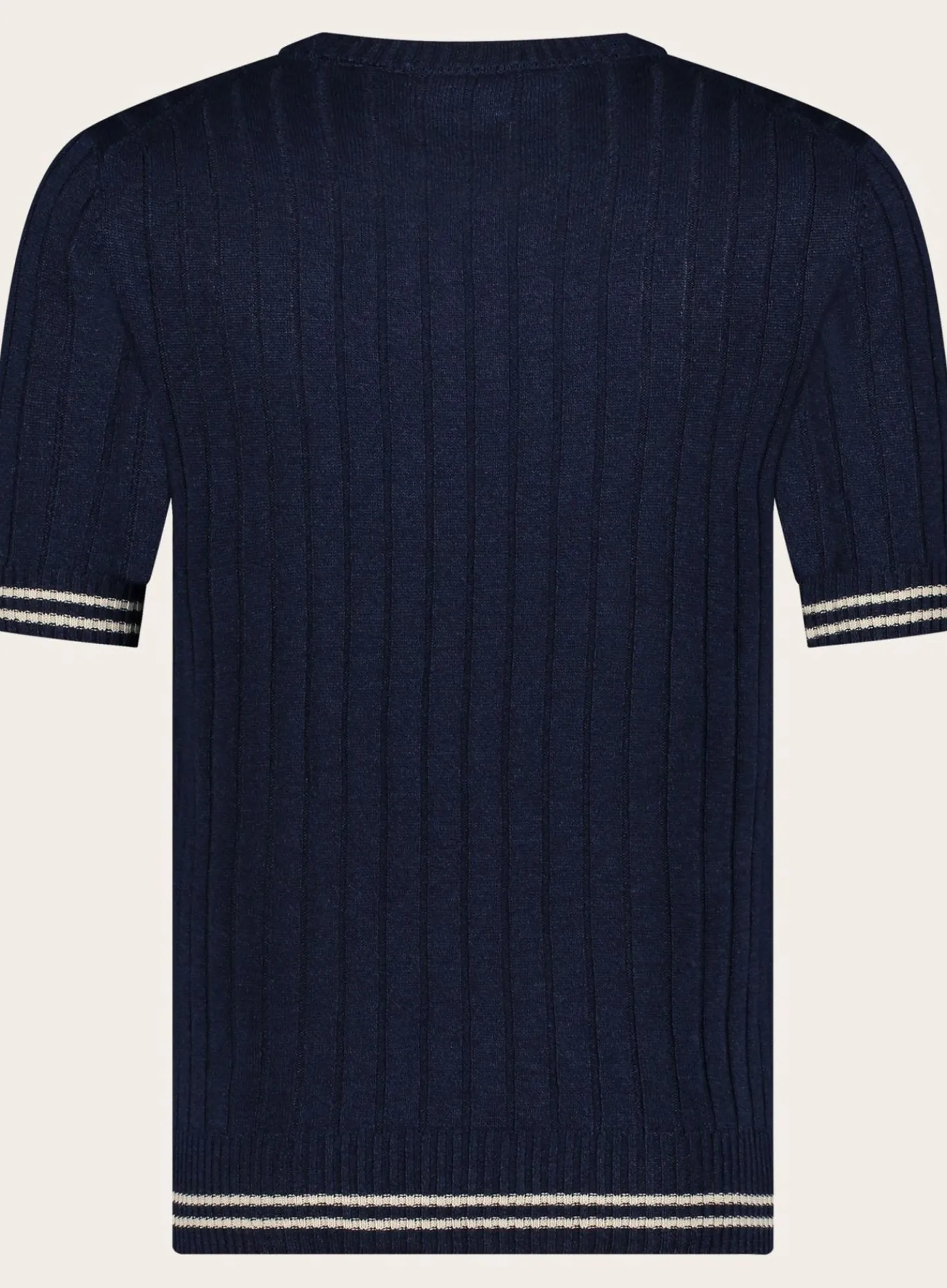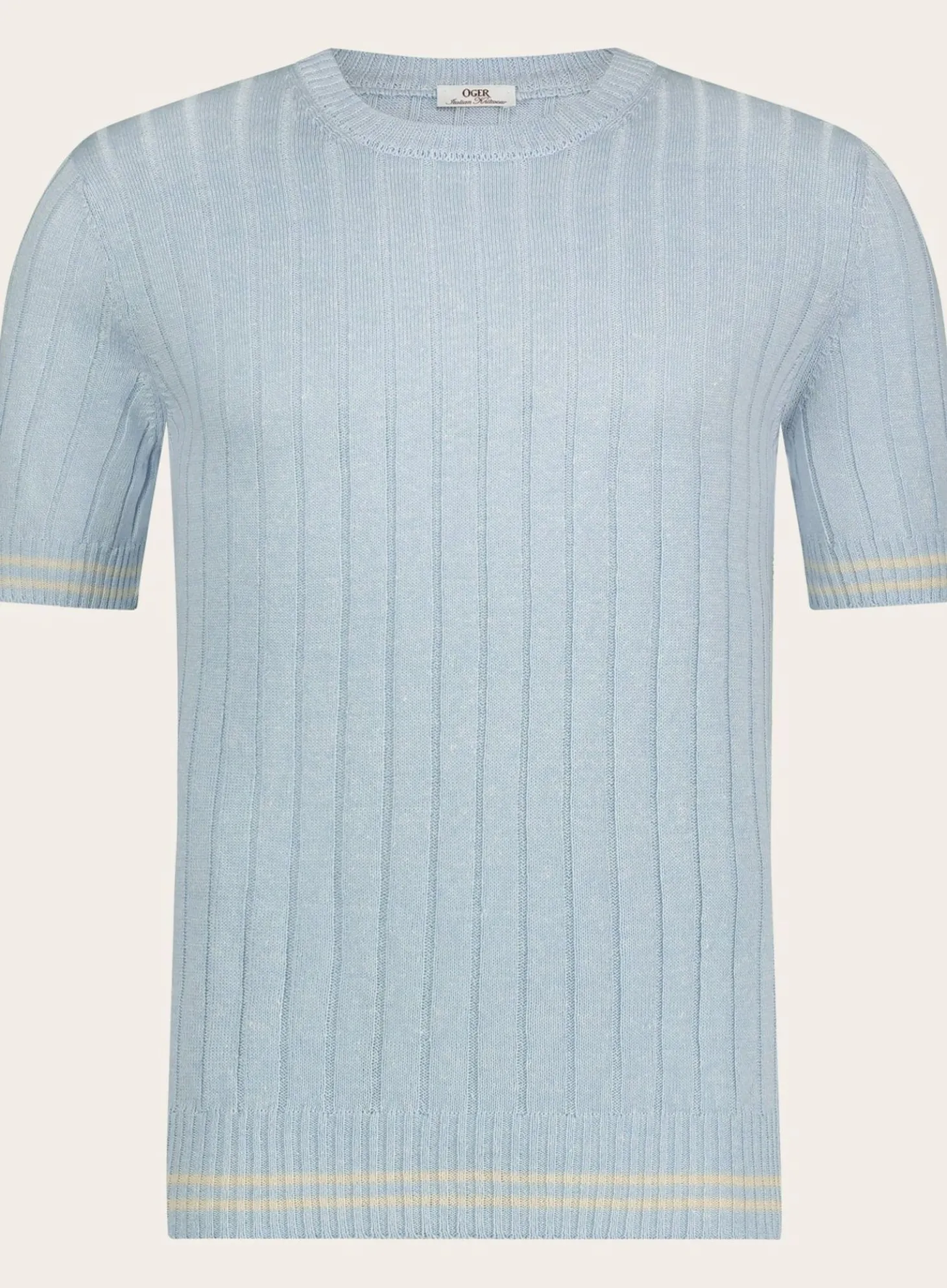 Dit Geribde T-Shirt Van Ogér Italian Knitwear Is Gemaakt Van Een Lichtgewicht Mix Van Linnen En Katoen, Biedt Het Optimale Koelte En Comfort Tijdens Warme Dagen. Het Subtiele, Verticale Ribpatroon Voegt Textuur En Diepte Toe Aan Het Design, Terwijl De Lichtblauwe Kleur Met Gele Boorddetails Een Vleugje Kleur Geeft Zonder Te Overheersen.