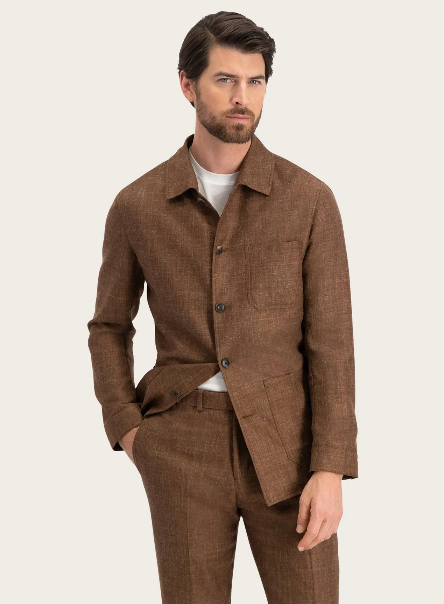 Het Jasje Van Ogér Is Vakkundig Ontworpen Met Een Klassieke Pasvorm Die Zowel Casual Als Formeel Gedragen Kan Worden. De Natuurlijke Mix Van Wol, Zijde En Linnen Verleent Het Jasje Een Subtiele Textuur En Een Ademende Kwaliteit, Waardoor Het Ideaal Is Voor De Overgangsperiodes.