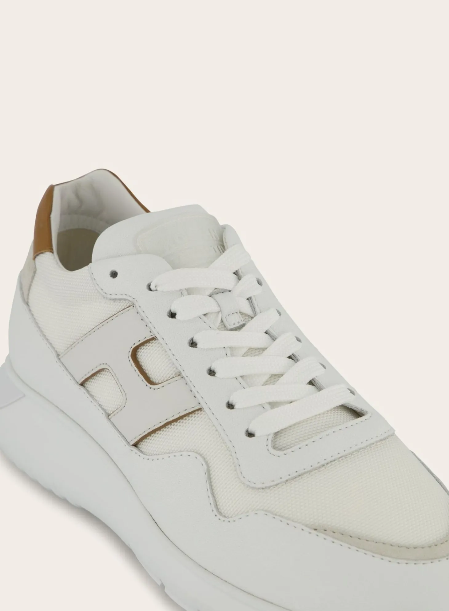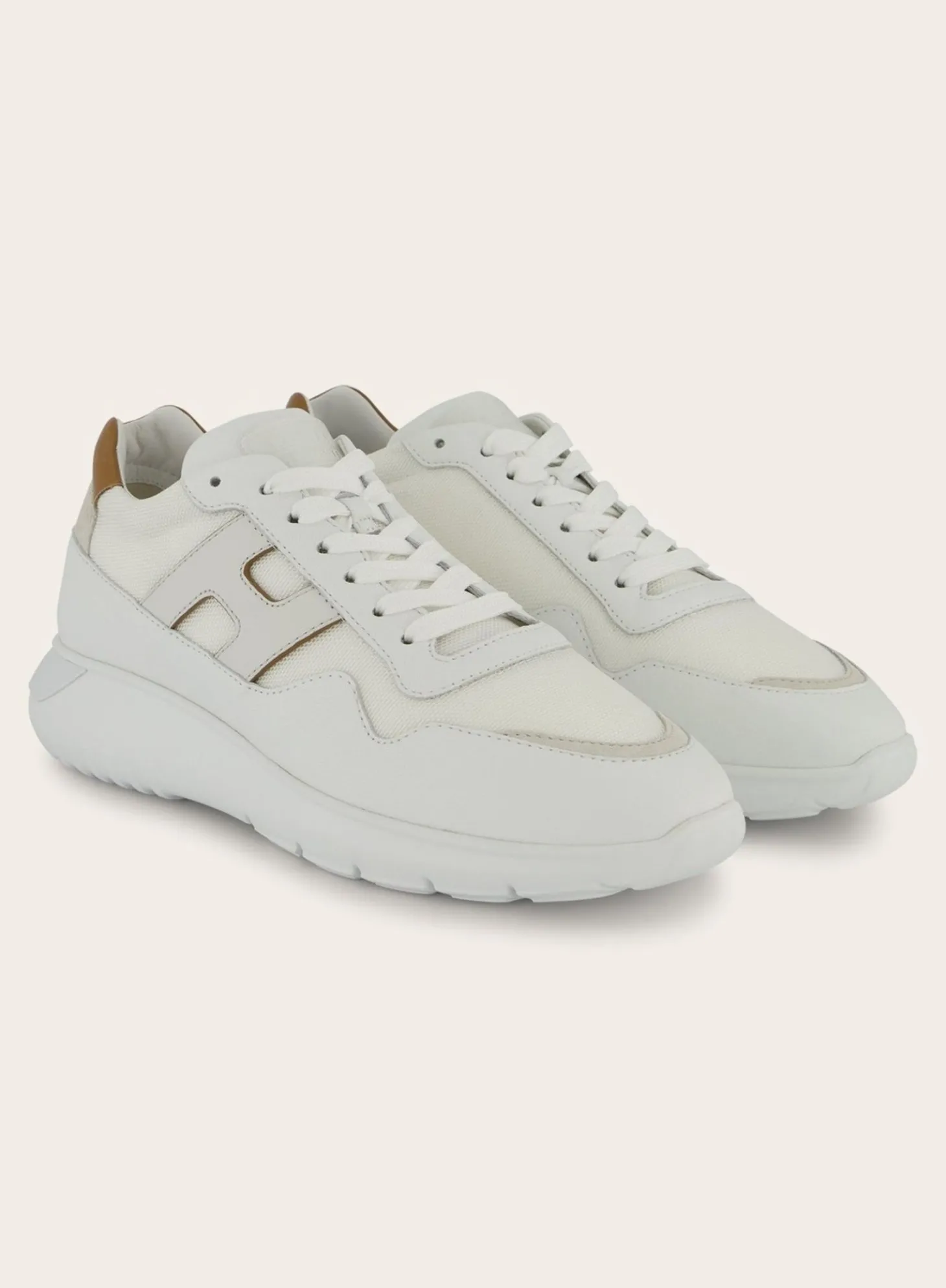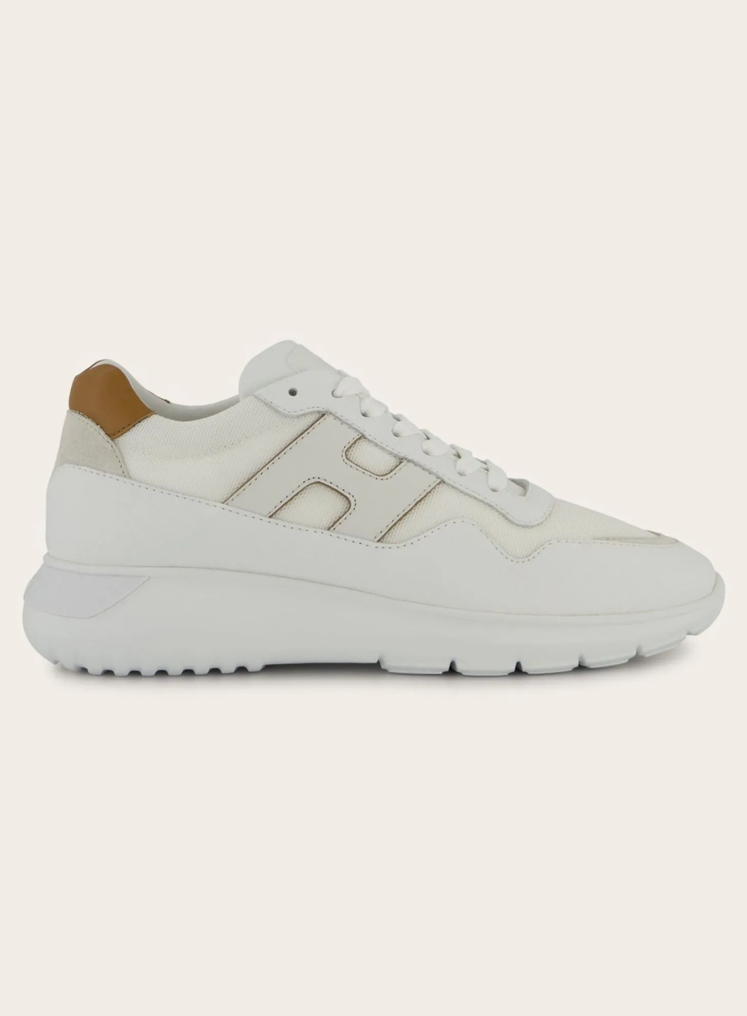 Deze Hogan Interactive³ Sneakers Zijn Uitgevoerd In Een Witte Kleurstelling, Verrijkt Met Taupe/Beige Suède Details. Het Iconische ‘H’-Logo Aan De Zijkant Is Uitgevoerd In Een Subtiele Lichte Tint.