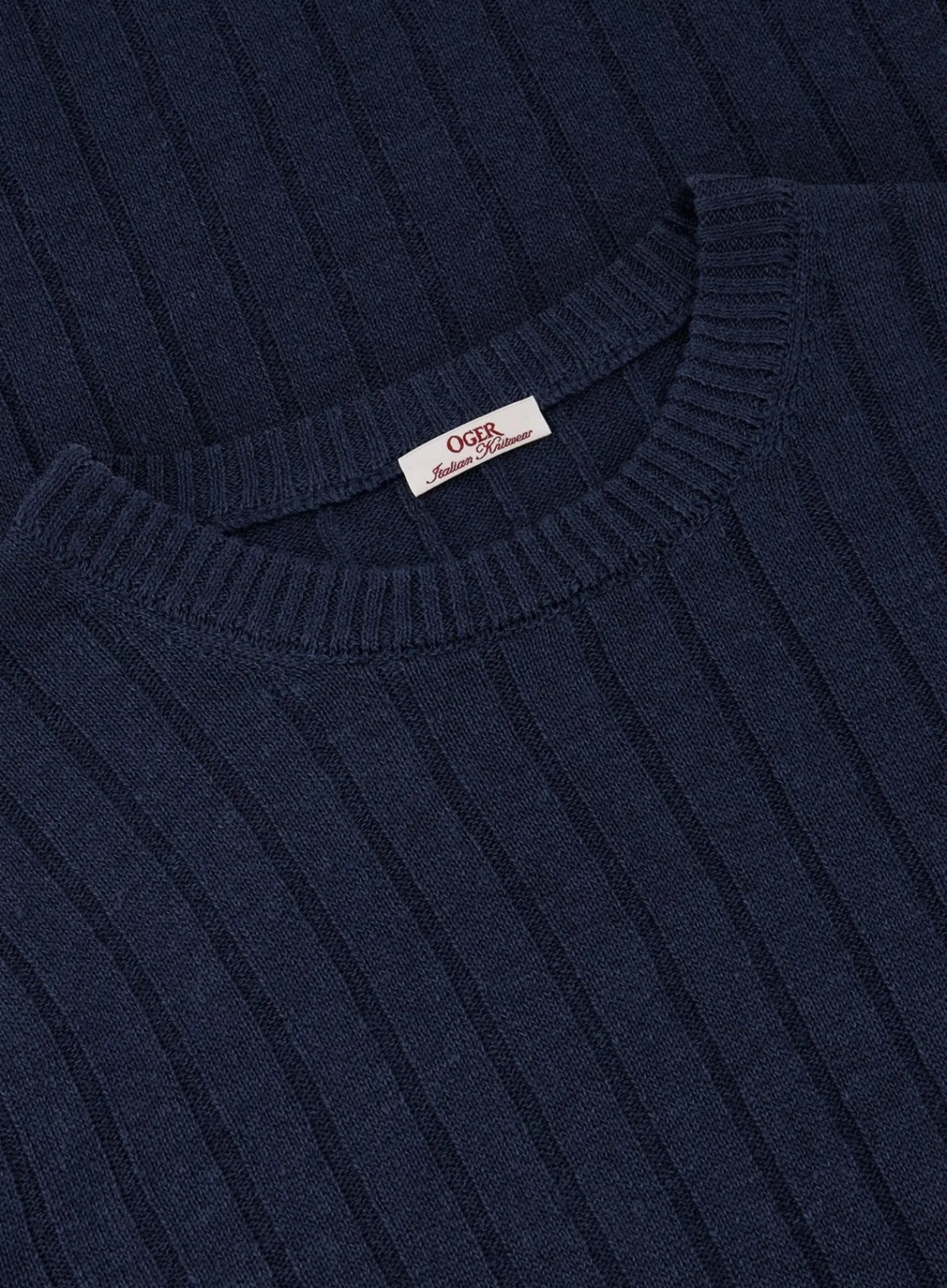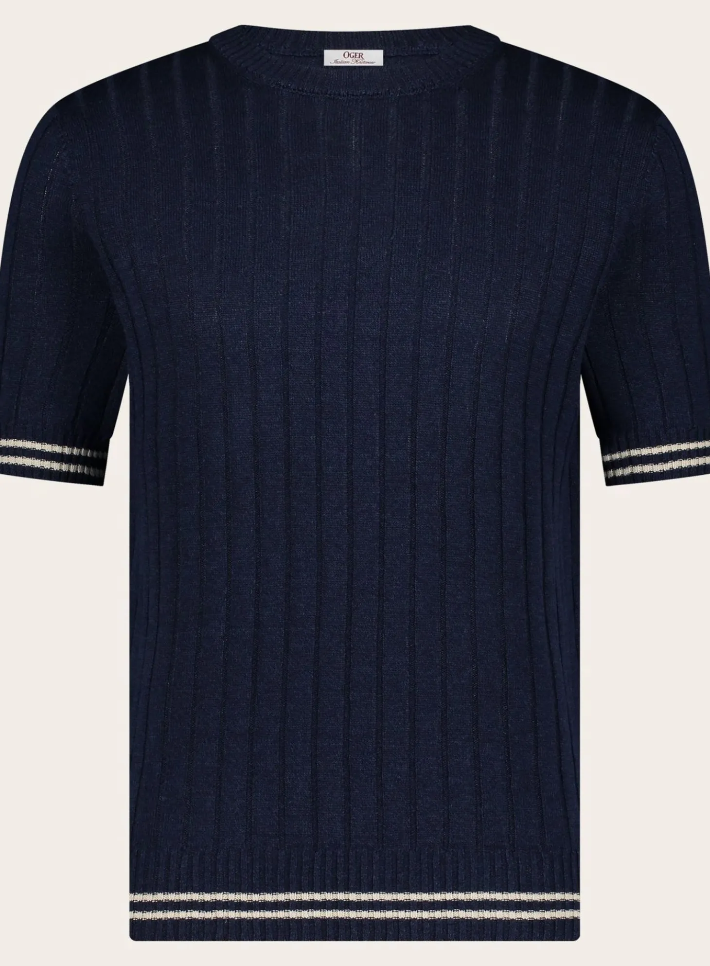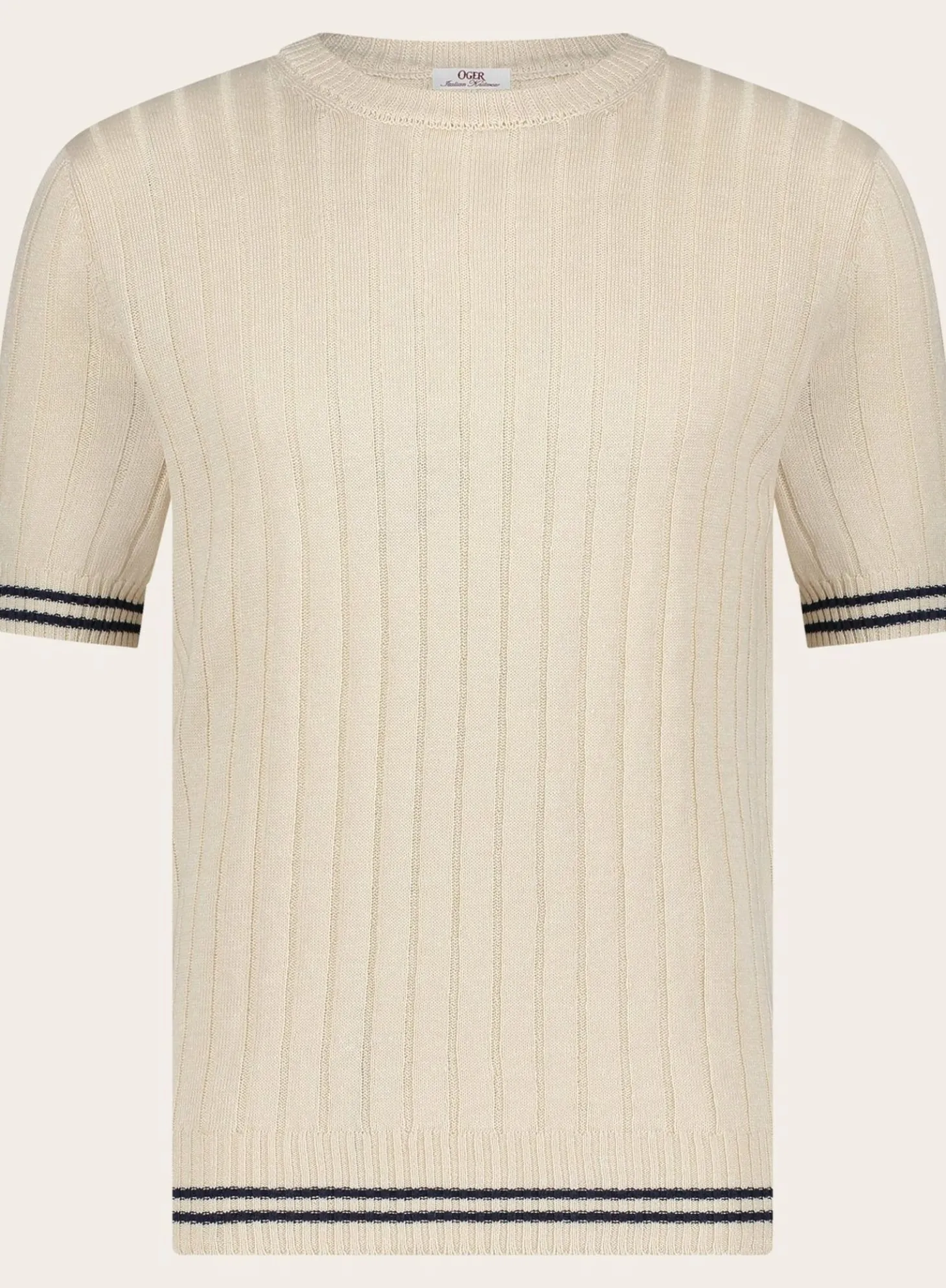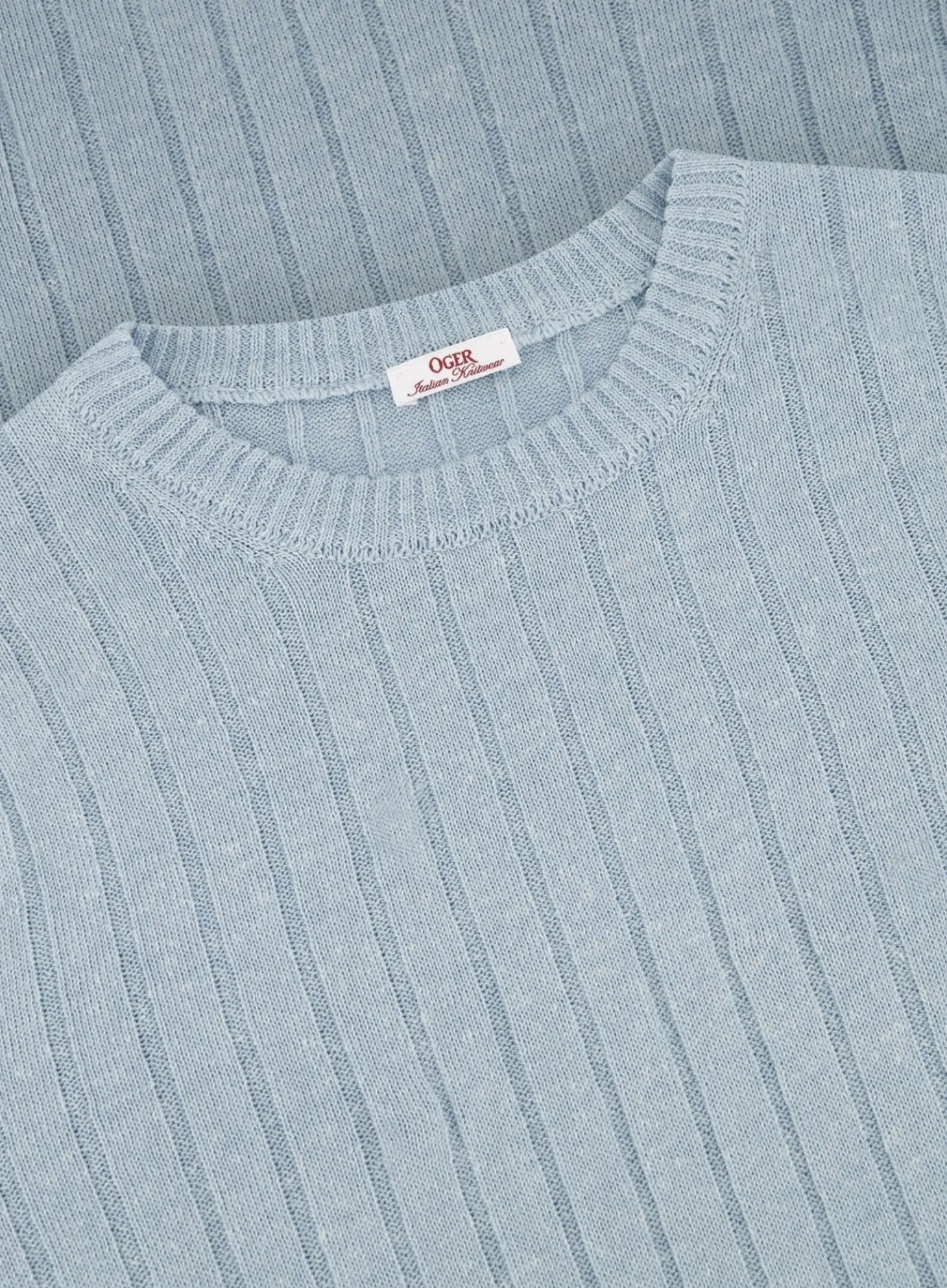 Dit Geribde T-Shirt Van Ogér Italian Knitwear Is Gemaakt Van Een Lichtgewicht Mix Van Linnen En Katoen, Biedt Het Optimale Koelte En Comfort Tijdens Warme Dagen. Het Subtiele, Verticale Ribpatroon Voegt Textuur En Diepte Toe Aan Het Design, Terwijl De Lichtblauwe Kleur Met Gele Boorddetails Een Vleugje Kleur Geeft Zonder Te Overheersen.