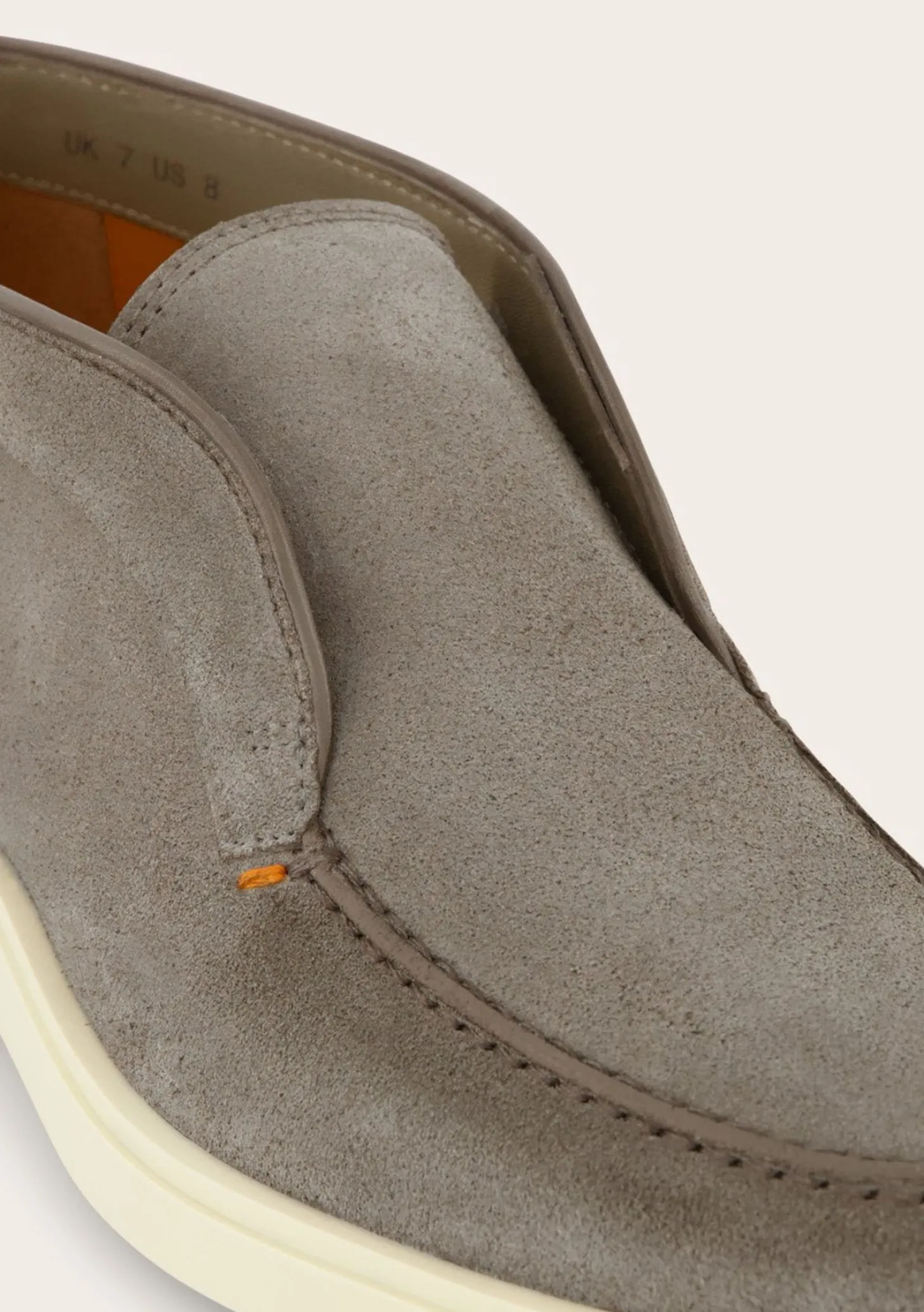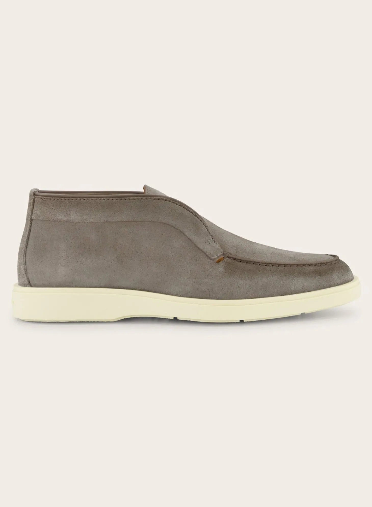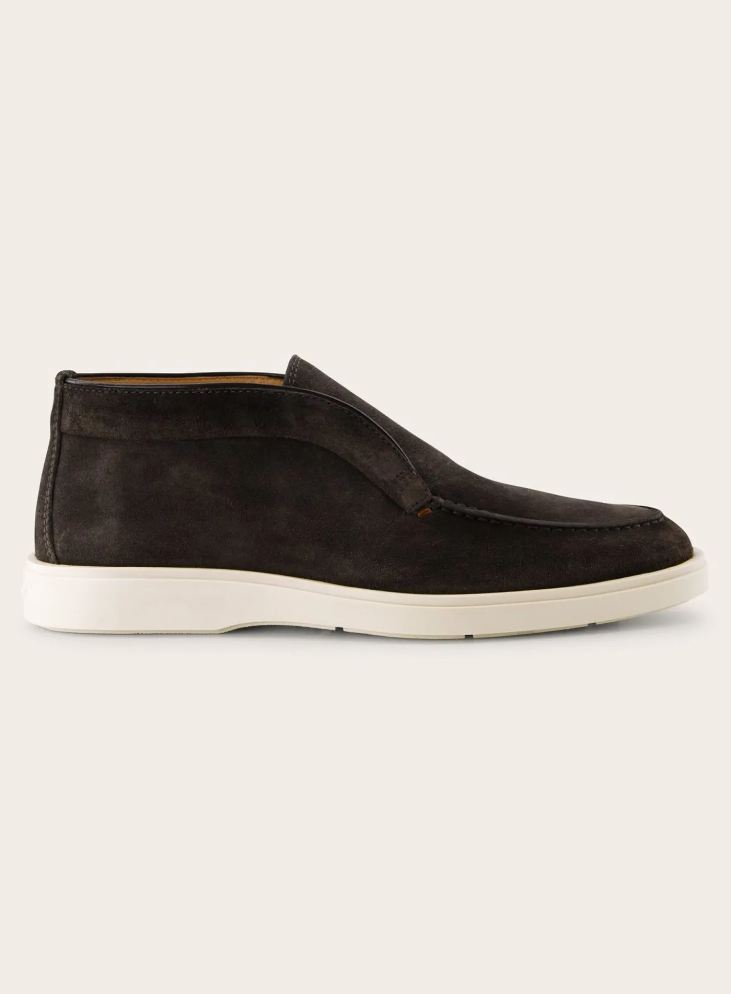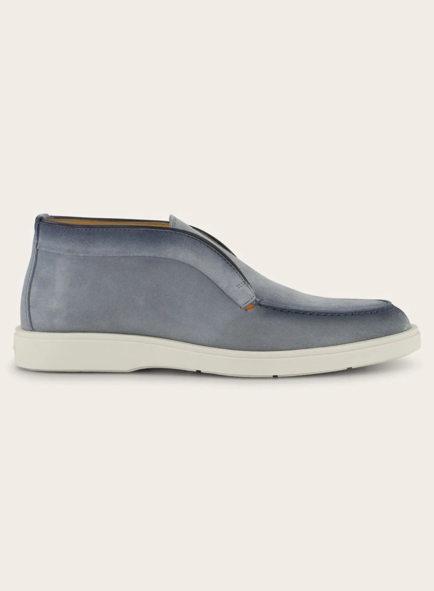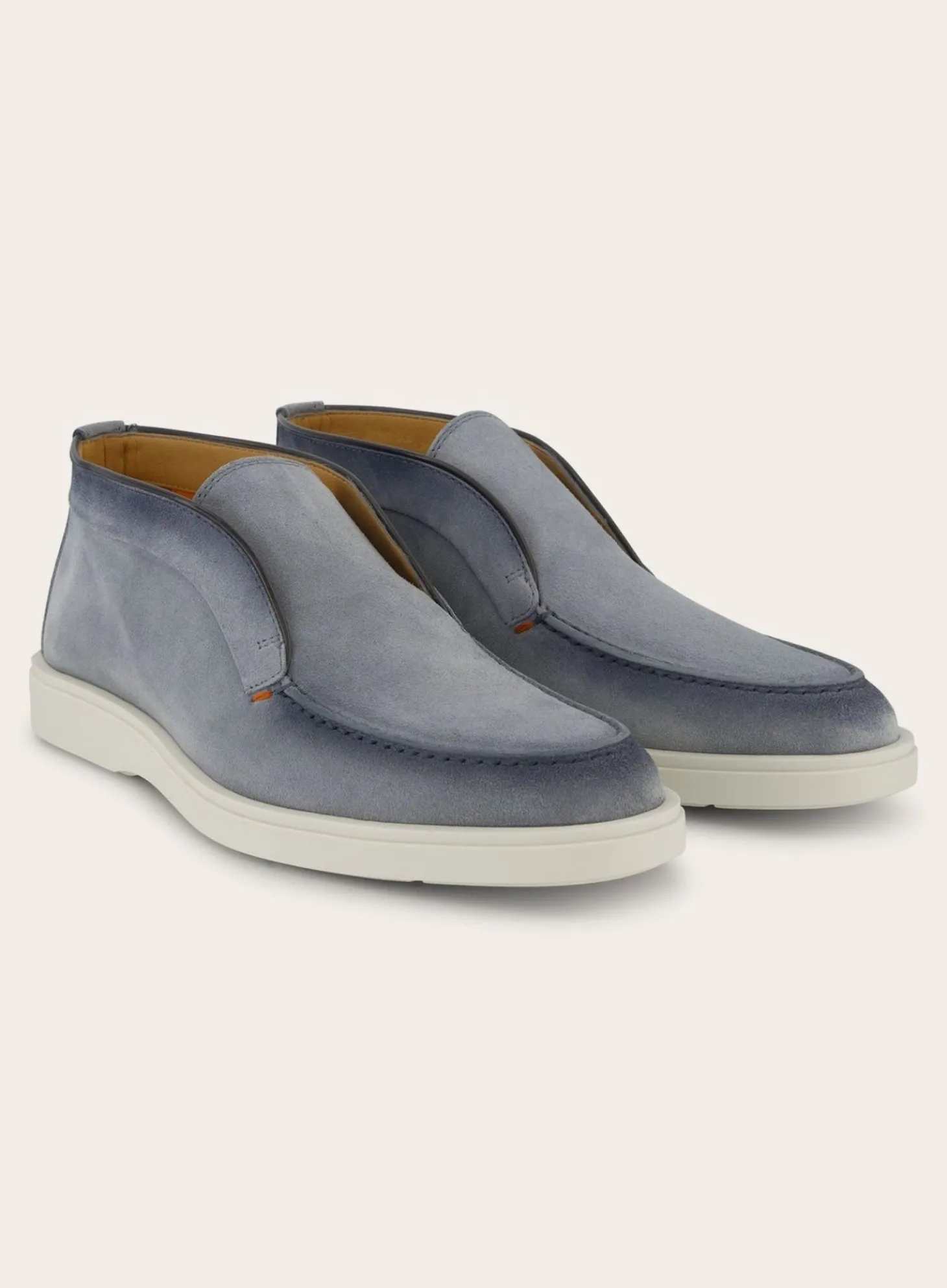 Deze Detroit Instappers Van Santoni Zijn Vervaardigd Uit Hoogwaardig Suède. De Gestikte Details Rondom De Neus En De Randen Geven Een Ambachtelijk Karakter, Terwijl De Contrasterende Witte Rubberen Zool Een Modern Contrast Biedt.